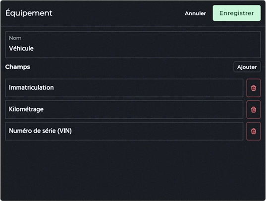 Définissez vos équipements par type et personnalisez leurs métriques spécifiques, comme le numéro de série ou les heures moteur.